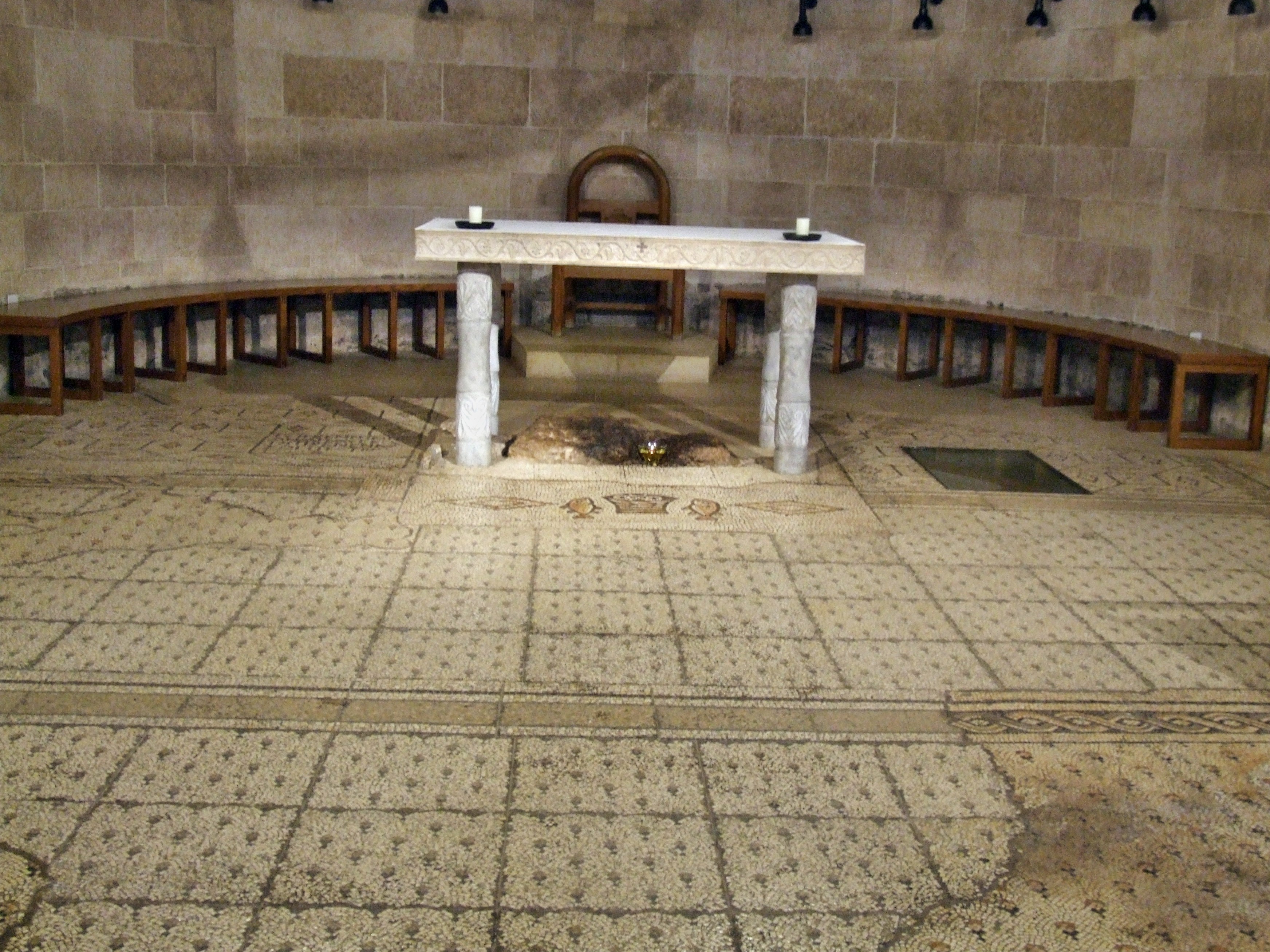 Kostel Mensa Christi První kostel na tomto místě byl postaven již ve 4. století. Jedná se o první kostel v Galileji, o kterém máme písemnou zmínku od poutnice Egerie z let 381–384: Tam u moře (Galilejského jezera) je rovina s množstvím trávy a palmami a navíc sedm pramenů, které poskytují spoustu vody. V této rovině Pán nakrmil lid pěti chleby a dvěma rybami. Kámen, na který Pán položil chléb, byl uzpůsoben jako oltář.